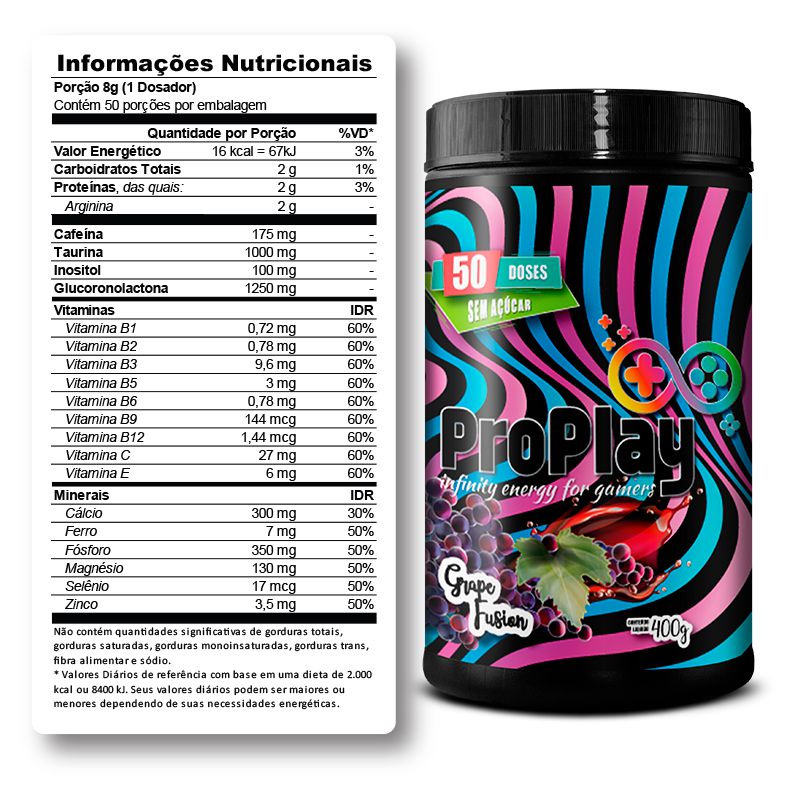 ProPlay Energy é uma fonte de energia que estimula seu metabolismo e sua concentração, sua fórmula contém cafeína, vitaminas e minerais, taurina e arginina.
